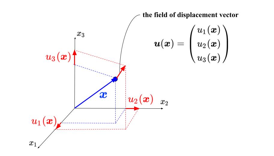 A strain tensor \(\varepsilon\) is defined using this displacement vector: