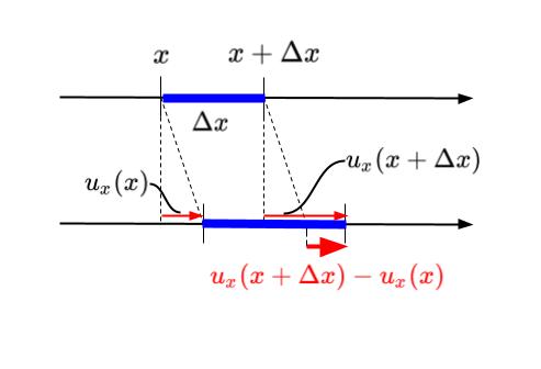 Figure 2.2.2 Deformation of a dilatable string in an unstrained (top) and strained state (bottom). We can see the diagonal element \(\varepsilon_{ii}=\frac{\partial u_i}{\partial x_i}\) represents the length changes per unit length in \(x_i\)-direction.