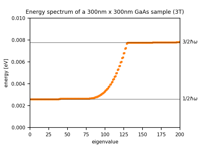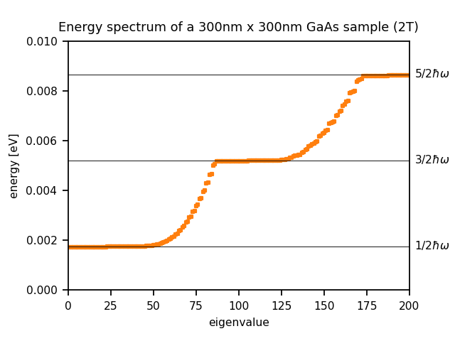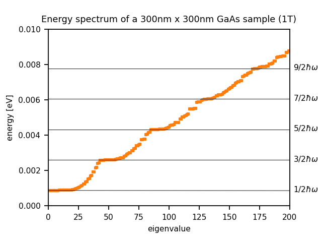 where \(L_x\) and \(L_y\) are the lengths in the x and y directions (300 nm in this example) and \(l_B\) is the magnetic length. Here we ignore spin.