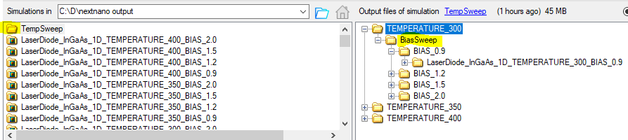 Either the option Single folders or Structured folders can be selected. The first option generates one unique simulation output folder for each input file (ergo, for this example separate 12 folders, see Figure 1.1.15), whereas the structured option generates nested output folders matching the sweep structure. For the structured option a global index can be included which enumerates each sweep (Figure 1.1.16). And/Or a parent folder - for each sweep - can be added (Figure 1.1.17).
