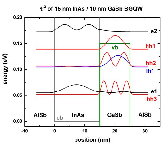 One can see a slight hybridization of the e1 and lh1 states, i.e. these states are mixed states whereas the heavy hole states (hh1, hh2, hh3) are not mixed and thus confined in the GaSb layer.