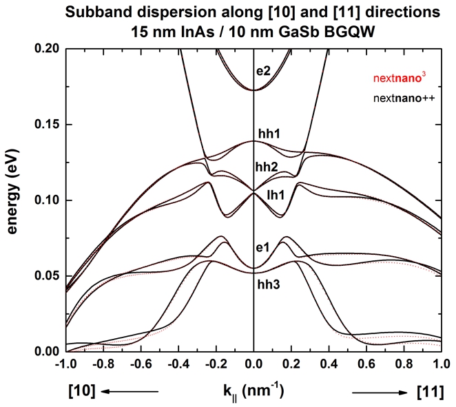 The following figure shows the E(k||) dispersion of the electron and hole states along the [10] direction and along the [11] direction in (kx,ky) space.