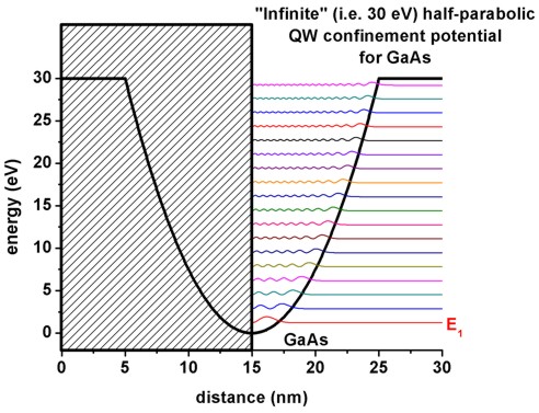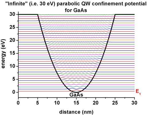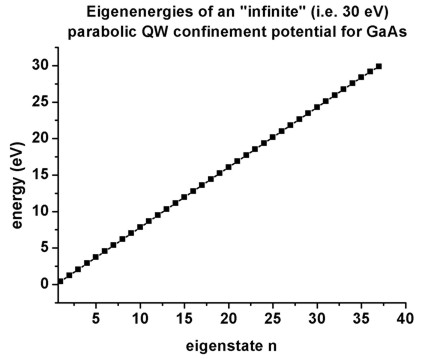 • The following figure shows the eigenstates of a parabolic quantum well (GaAs) where the confinement is assumed to be 30 eV.